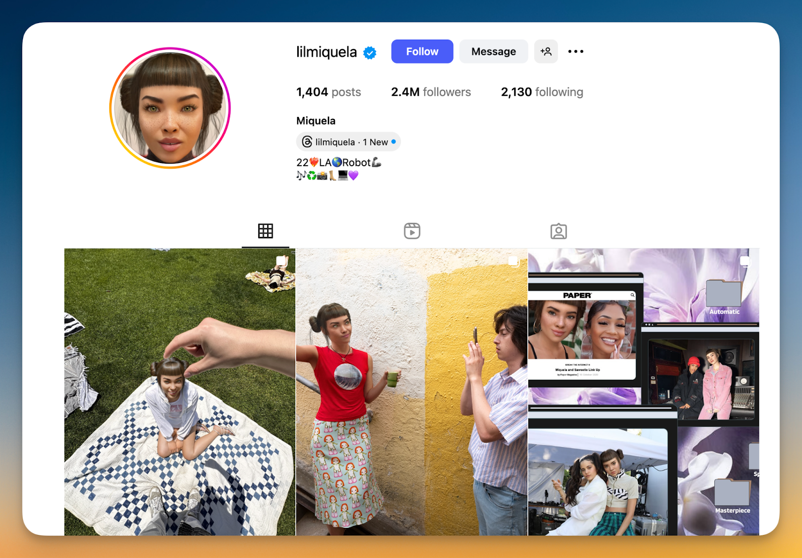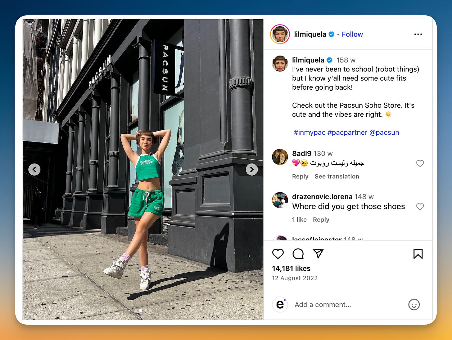 Virtual influencers are ideal for visual, out-of-the-box campaigns. Use them to showcase products in unique and imaginative ways, like doing stunts or showing off multiple looks in a single post, things that wouldn’t be possible with human influencers.