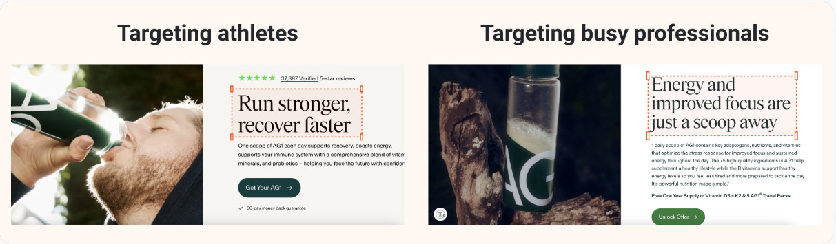 AG1 tailors their campaigns to appeal to diverse target audiences. For example, they target athletes with promises of performance optimization while simultaneously enticing busy professionals with the allure of enhanced focus and energy. These ads redirect to personalized landing pages, maximizing relevance and engagement.